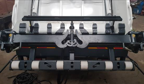 Замковая система закрытия заднего борта с уплотнительной резинкой по периметру. Данное решение делает мусоровоз герметичным, что исключает проливание жидкости, образующейся в результате прессования отходов.