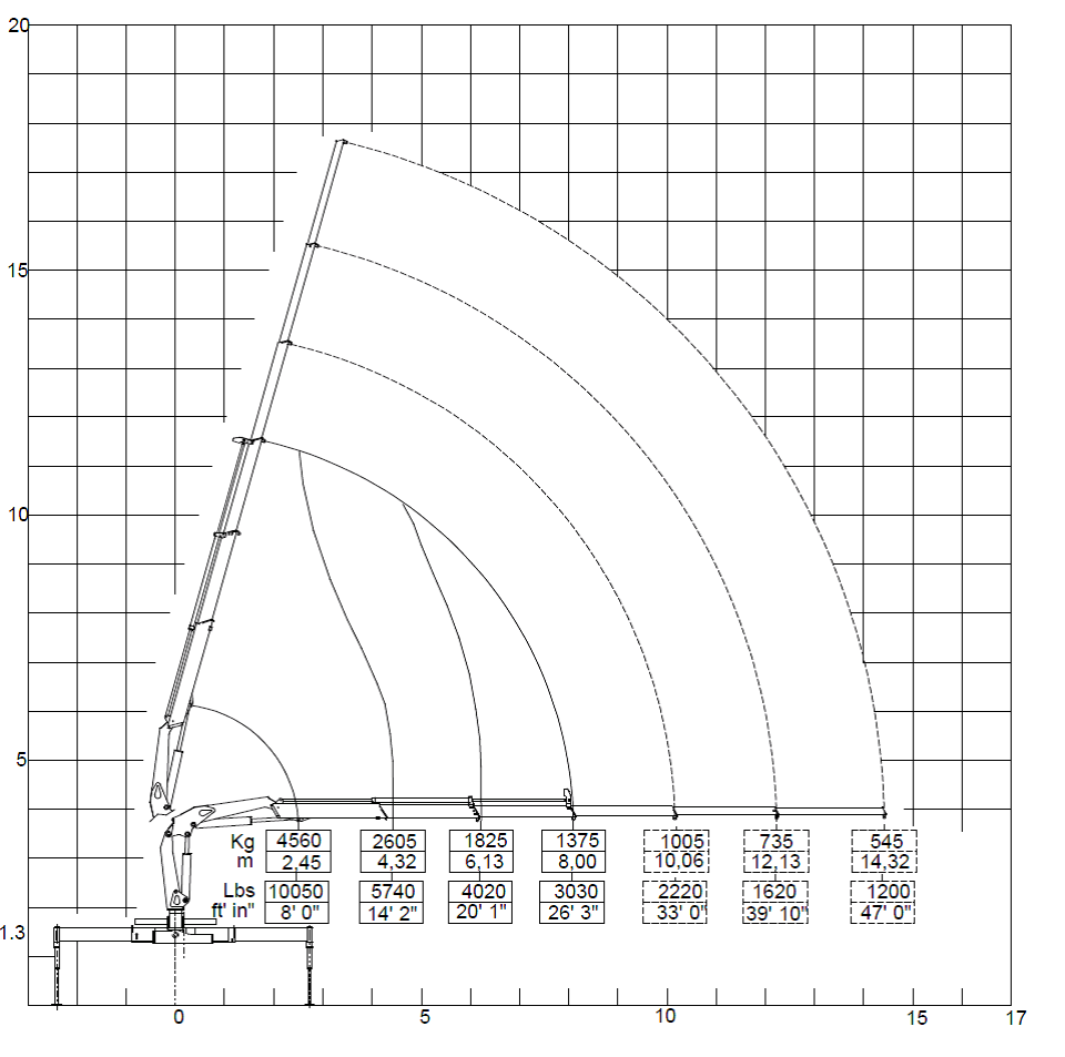 • Максимальный вылет стрелы: 8,00 м / Грузоподъемность при максимальном вылете стрелы: 1375 кг.