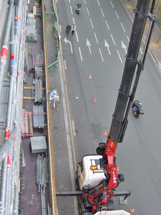 На картине показан кран-манипулятор- Thor-K6, Fly-Jib FJ1200-K6. Компания Le Bras Frиres S.A.S. устанавливает строительные леса на здании Quai Malaquais в Париже.