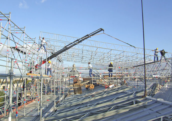 Показан кран-манипулятор Thor-6 на крыше здания. На заднем плане виднеется купол Французской Академии.