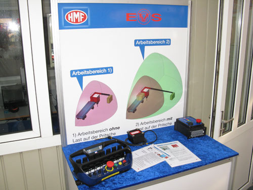 Большое количество посетителей на стенде HMF интересовались известной системой EVS - система безопасности стабильности. Особое внимание уделяется возможности использования оператором нагрузки на кузов автомобиля в качестве противовеса для использования оптимальной производительности КМУ.