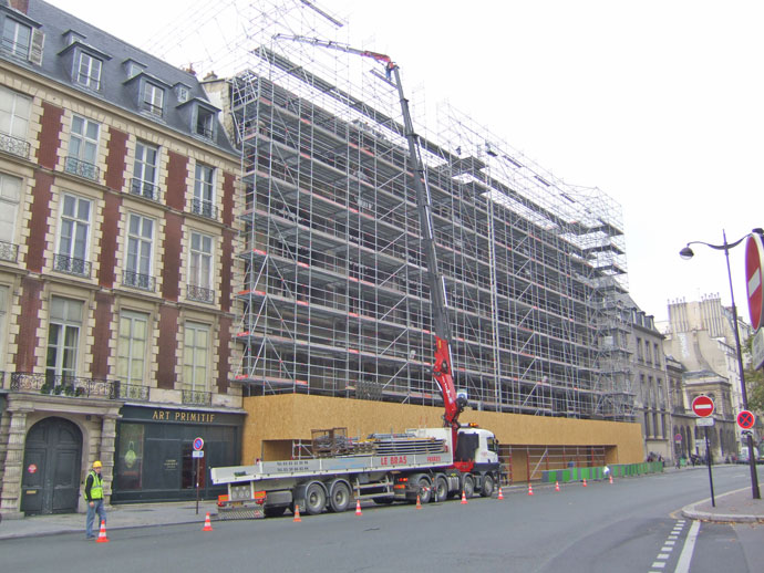 На картине показан кран-манипулятор- Thor-K6, Fly-Jib FJ1200-K6. Компания Le Bras Frиres S.A.S. устанавливает строительные леса на